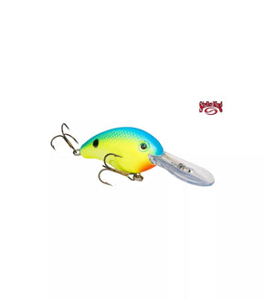 Floating crankbait type lure size medium from 110 millimeters of the brand Strike King Pro Model 4S Series in color yellow, green and blue. This fish excels in shallow water. Its oversized breastplate bounces off obstacles as it flows into the middle layers of water.