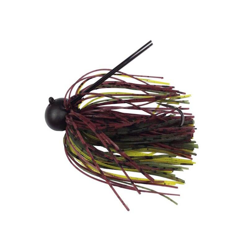 Jig of the brand Hart K Rugby pattern in color reddish brown and yellow-green of 14 grams. It has rugby shape and soft silicone skirts. It has lacquered paint and extra sharp hook with anti algae.