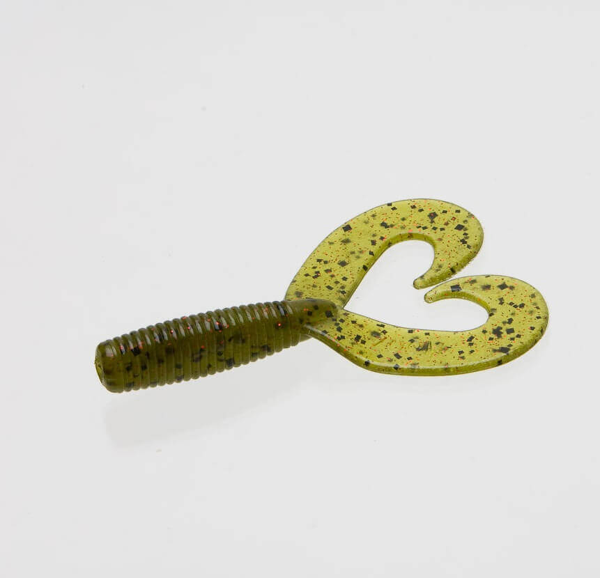 Soft Lure worm-shaped fat and wavy body with twin larval tails from 90 millimeters of the brand Zoom model Fat Albert Twin color green with red and black stripes. It is impregnated with salt. Contains twin tail twisting action to move lots of water. The twin curly tails create a flapping action and bass call when hitting the water. Designed for a tow of jig or as a trailer on a spinnerbait or buzzbait.
