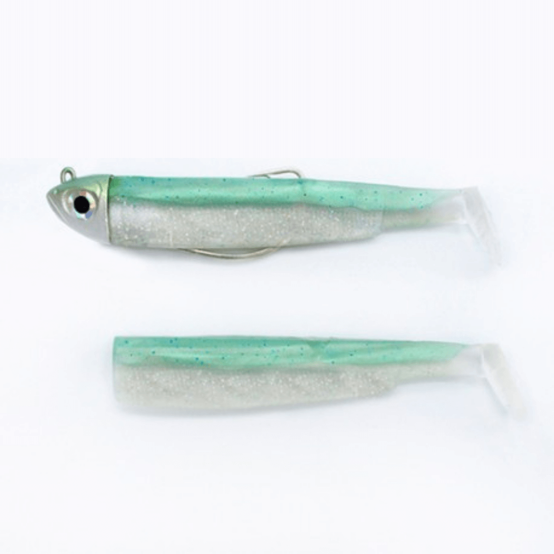 Combo vinyl assembled from the brand Black Minnow Fiiish model Shore from 120 millimeters in color green and white from 12 grams of the size number 3, special for Black-Bass and predators fishing.
