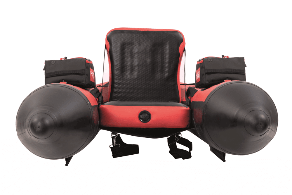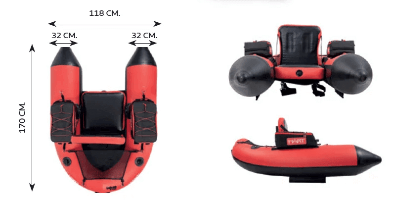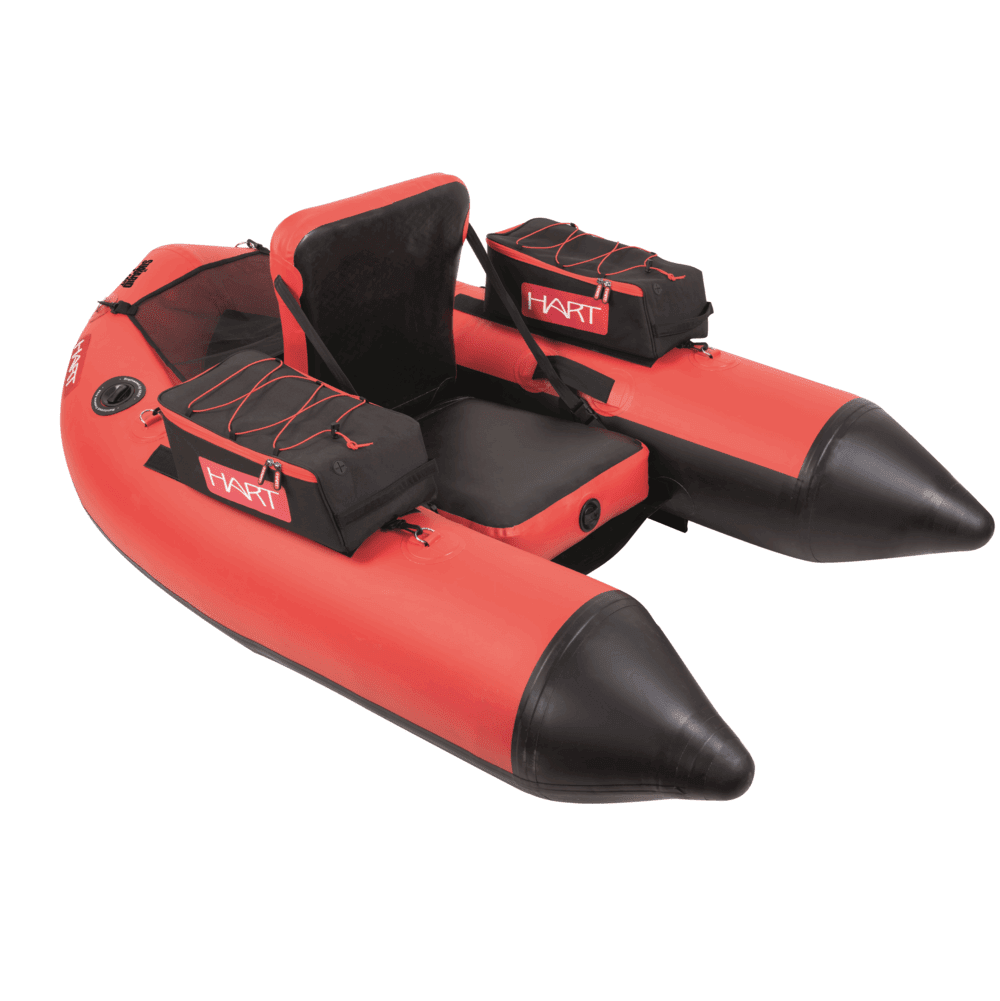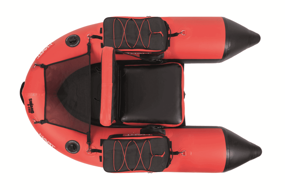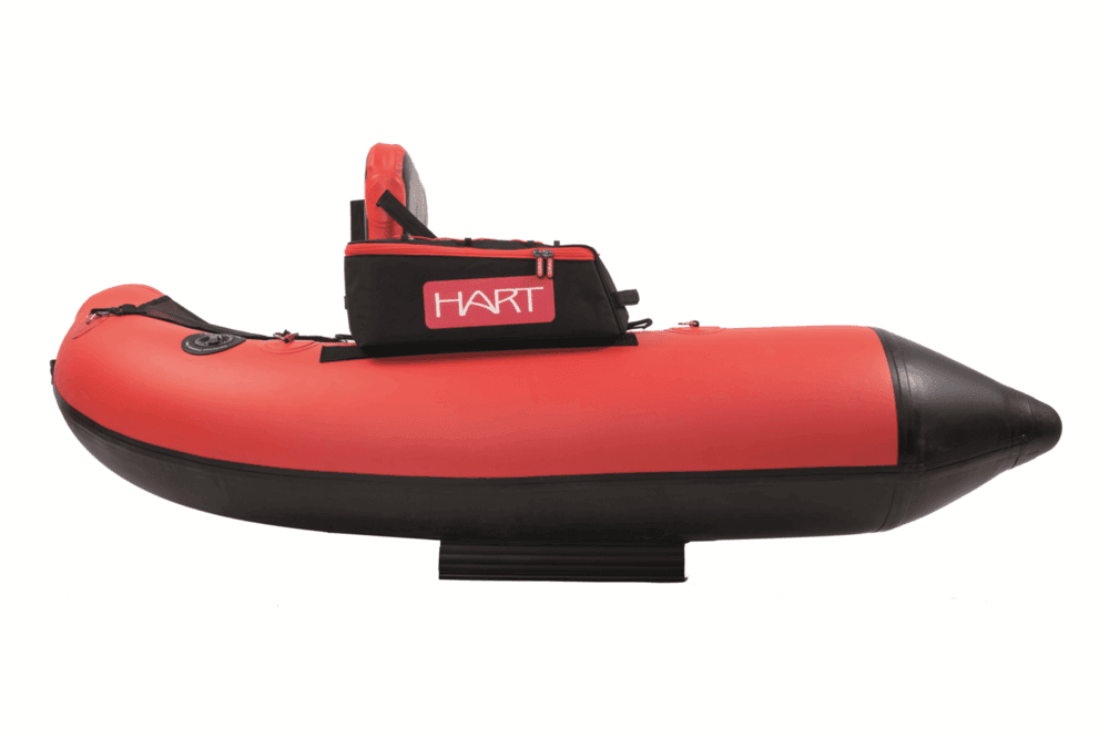 Float tube brand Hart model Sikkario X-Fast in color red and blackspecial for Black-Bass and predators fishing.