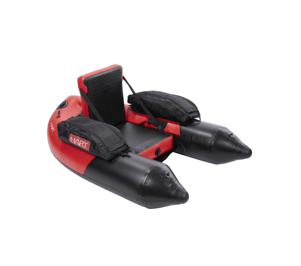 Float tube of the brand Hart model Vendetta V2 in red and black color, special for fishing of the Black-Bass and predators.