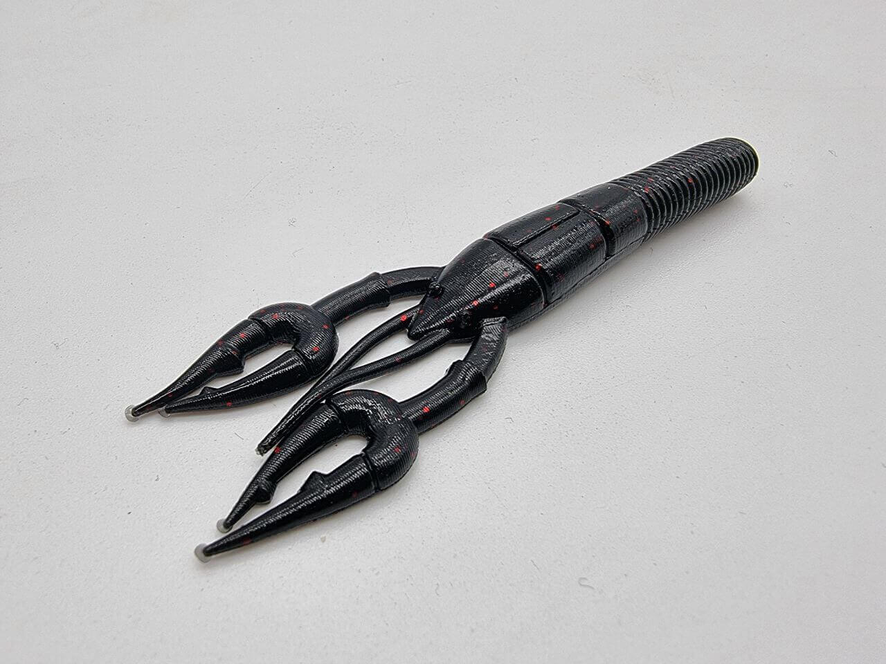 Soft Lure crab-shaped from 95 millimeters y 7 grams weight of the brand Yamamoto model Fat Baby Craw color black with red stripes, special for bass and predator fishing.. It has a round body and claws. It is impregnated with salt.
