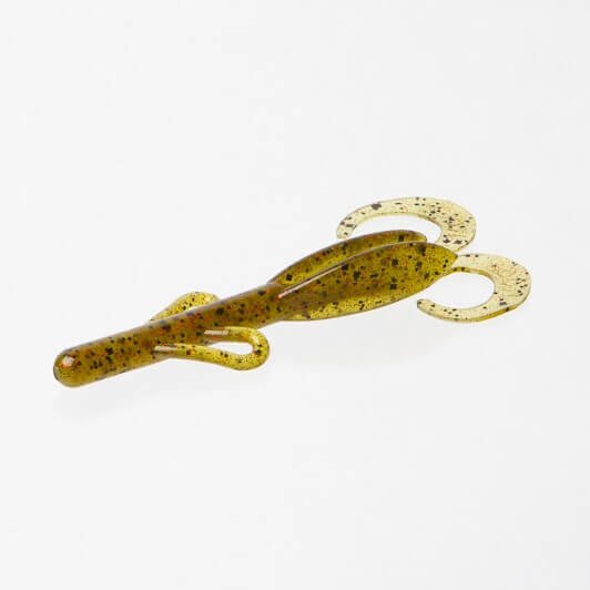 Soft Lure insect-shaped solid body and multiple appendages from 114 millimeters of the brand Zoom model Midsize Brush Hog in color green with red and black stripes. It is impregnated with salt.