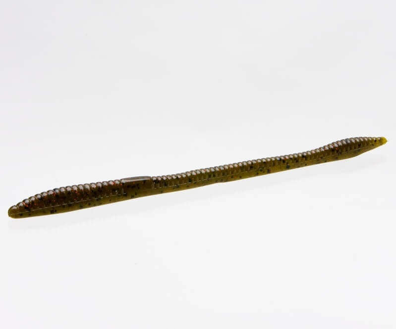 Soft Lure with straight-tailed worm shape of 170 millimeters of the brand Zoom model Trick Worm color green with spots red and black. It is a standard segmented worm with natural sliding action. It is impregnated with salt. Contains 20 units